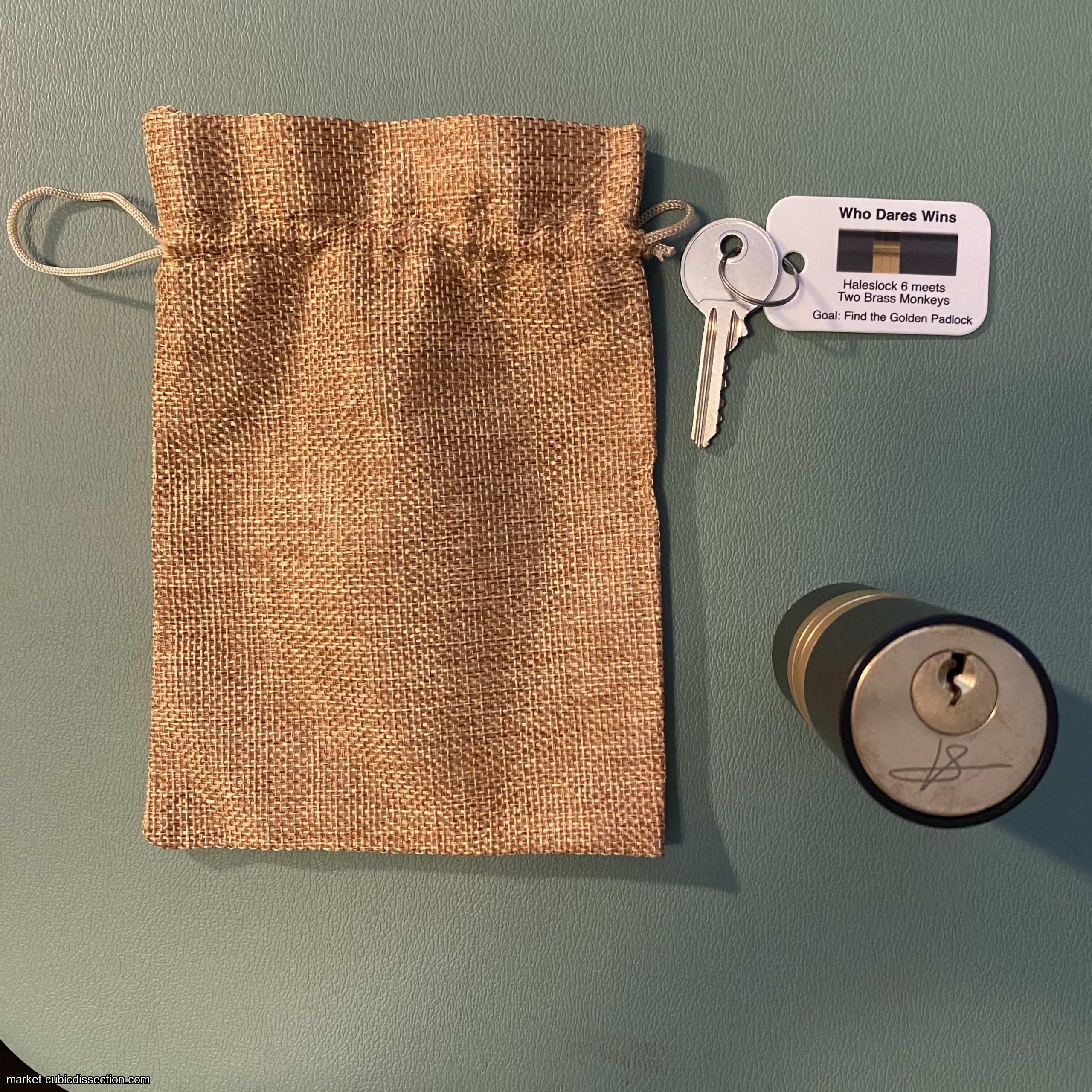 What do you get when you take Two Brass Monkeys and throw them in a room with a master locksmith?  The result is "Who Dares Wins," Shane Hales 6th puzzle lock which came to fruition through collaboration with Steve Nichols and Ali Morris, The Two Brass Monkeys.  "Who Dares Wins" is a tactilely pleasing cylindrical puzzle lock, with its matte black anodized aluminum and contrasting shiny brass.  The goal, of course, is to open the lock, and discover the highly coveted GOLD PADLOCK!!!  This puzzle TRULY tests the sensibilities of the puzzle-solver!