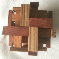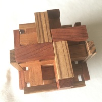 An interlocking puzzle designed by Junichi Yananose (Juno) in 2012. He decided to put a cube inside the puzzle in 2017 to give more contrast with the colour of the timber.