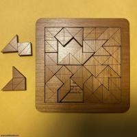 Windmill is famous and prolific puzzle designer Stewart Coffin's design number 144.  It's a tray packing puzzle, the idea behind it stemming from the dissection of a square into 68 isosceles right triangles and combining them into 17 dissimilar non-symmetrical puzzle pieces.  (I guess that only great minds can think of tortuous challenges such as this!)  For more information on Windmill, including the origin of its name, go here to Stewart's AP-ART book, p. 170.  This copy of Windmill was beautifully laser cut and engraved in cherry by long-time exchange puzzle producer Walt Hoppe, and used by the late great Tom Rogers (co-founder of the Gatherings for Gardner) as his exchange puzzle at IPP23 held in Chicago in 2003.  I will include a copy of the solution to Windmill from the IPP23 exchange booklet.
