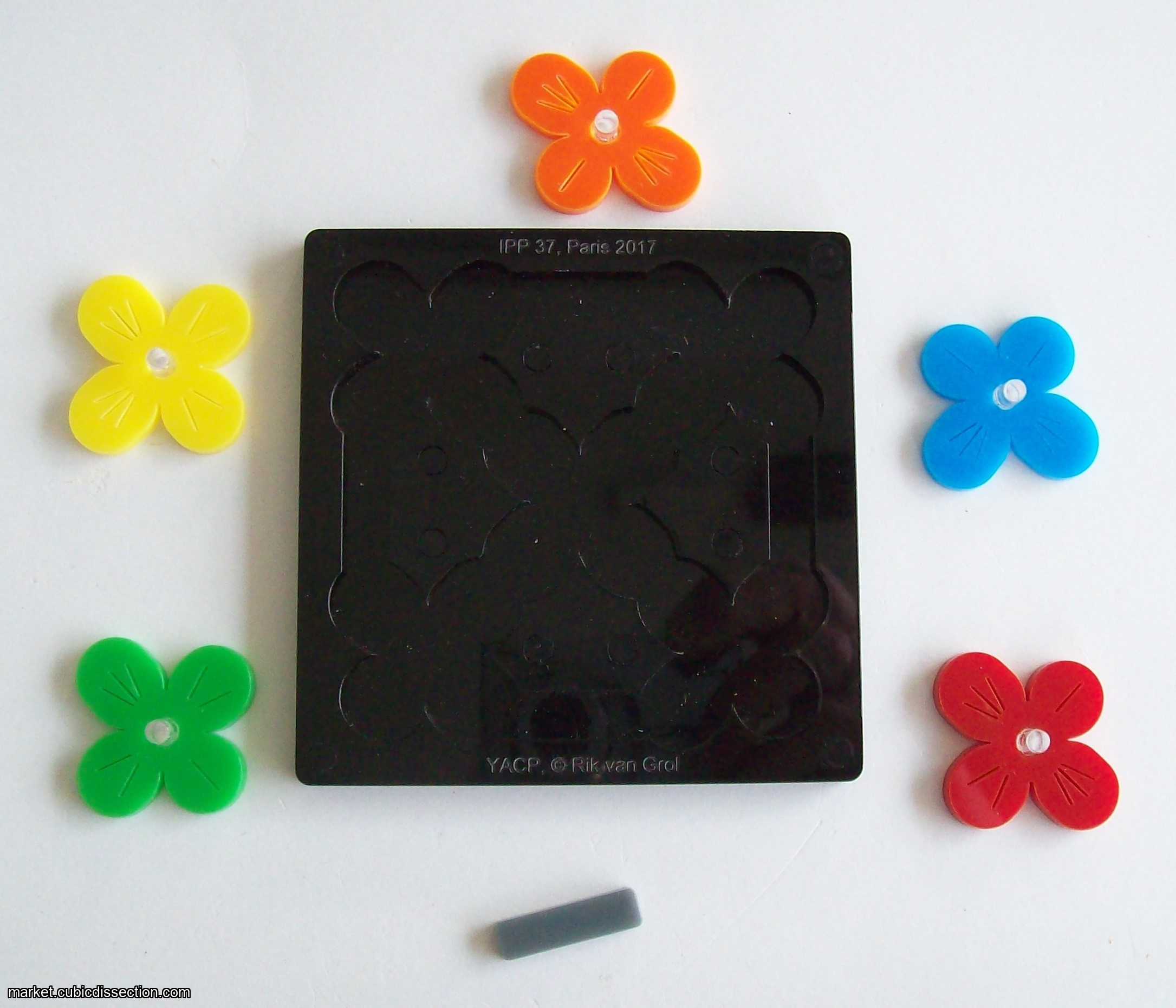 Place all five clovers and the grey rectangle flat in the tray.