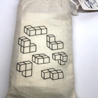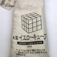 A 3x3x3 unit cube 7 piece assembly puzzle.  Not the Soma configuration--two pieces are different. Brand is "Wooden Toy MOCCO by HEIWA" with the name Yellow Cube Puzzle and catalog number PZ-6. Comes unassembled with solution sheet in original printed drawstring cloth bag with "yellow cube puzzle PZ-9" printed on front and store price tag on drawstring.
